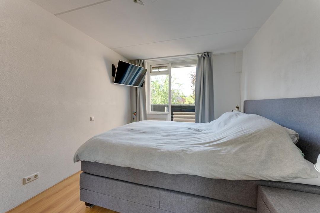 Eerste verdieping: overloop met trap naar 2e etage, 2 slaapkamers aan de achterzijde waarvan 1 met toegang tot het balkon over de volledige breedte van de woning (5m), 3e slaapkamer aan de voorzijde en luxe badkamer met bad, inloopdouche, wastafel met 2 kranen, handdoekradiator en toilet. Deze gehele verdieping is voorzien van een fraaie lichte laminaatvloer.