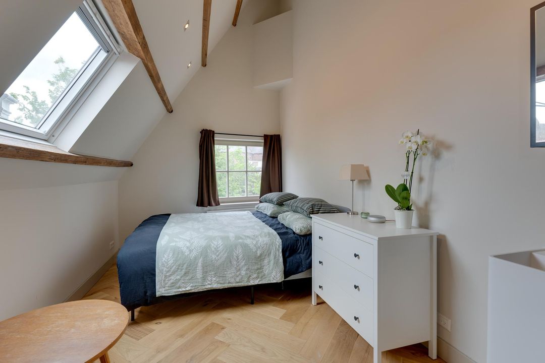 Communal entrance to the third floor. Own entrance. Spacious hall with separate toilet with hand basin, spacious living room at the front with three windows overlooking the canal! Modern kitchen with all conceivable built-in appliances such as a hot air oven, fridge/freezer, black extractor hood, induction cooker and finished with a marble worktop. From the kitchen to the balcony. The wide frontage with many windows provides a beautiful light. The first bedroom with sofa bed and desk, located at the rear with doors to the second balcony. The bedroom has a beautiful bathroom with walk-in shower and washbasin. Via fixed stairs to the fourth floor. Landing with central heating boiler and washing machine. At the front is the second attractive bedroom with double bed and storage closet.
